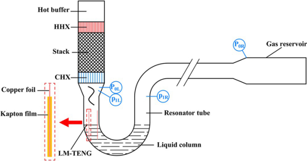 基于此,该课题组近期提出将液态金属基摩擦纳米发电机(LM-TENG)耦合在驻波型气-液谐振热声发动机谐振管中,从而构建出一种完全无固体运动部件的高可靠的热声发电系统。该发电系统的工作原理为:热声发动机利用热致声效应将外部热源的热能转化为工作气体往复振荡的声能,气体的往复振荡驱动U形谐振管中的液态金属液面做升降往复运动,使得摩擦纳米发电机中两种摩擦电性质不同的材料(液态金属和摩擦材料)表面周期性接触和分离,利用两种材料之间摩擦/接触起电产生的电荷分离和感应电荷产生的电势差驱动外接电路中自由电子流动,进而将驱动两种材料接触分离的声能收集起来并转化成电能输出,最终实现从热能到电能的持续、稳定转换。实验中,热声驱动液态金属基摩擦纳米发电机获得了最高15 V的开路电压输出,验证了这一新型热声发电技术的原理可行性。