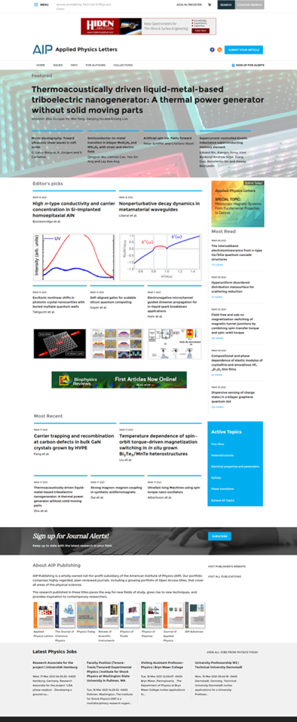 相关研究成果以Thermoacoustically driven liquid-metal-based triboelectric nanogenerator: A thermal power generator without solid moving parts为题,在线发表在Applied Physics Letters上,并被选为Featured Article。理化所罗二仓和研究员余国瑶为论文通讯作者,特别研究助理朱顺敏为论文第一作者,中科院北京纳米能源与系统研究所研究员唐伟对该工作的实验设计提供了指导。上述研究工作得到国家重点研发计划和国家自然科学基金的资助。