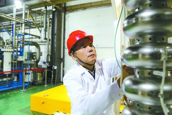 潘卫民在检查质子加速器超导腔模组。中科院高能物理研究所供图