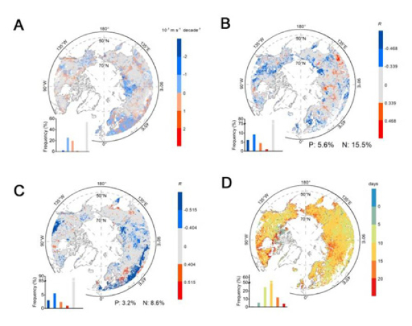 A、高纬度区域风速变化;B、风速和植被落叶期偏相关;C、风速和土壤水分相关分析;D、未来风速模拟的误差分析