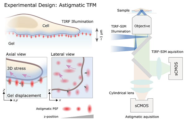 生物力学(mechanobiology)是研究生命活动中相关力学特性的学科。细胞的生物力学特性与生命活动的一些功能相关,如肿瘤免疫过程、器官的衰老、皮肤和伤口愈合、血管形成、淋巴功能、骨骼、神经元和眼睛活动等生命过程。这些微观力学过程通常发生在亚微米、皮牛和亚秒尺度。牵引力显微镜(traction force microscopy)是最广泛应用于生物力学研究的技术之一,其利用弹性物质表面的荧光微球探针观测细胞和弹性物质互作过程中的微观作用力。然而,传统的牵引力显微镜受限于获取微球位移的精度和速度,只能以稀疏的荧光微球作为探针进行慢速的微米尺度二维观测,应用范围受限。