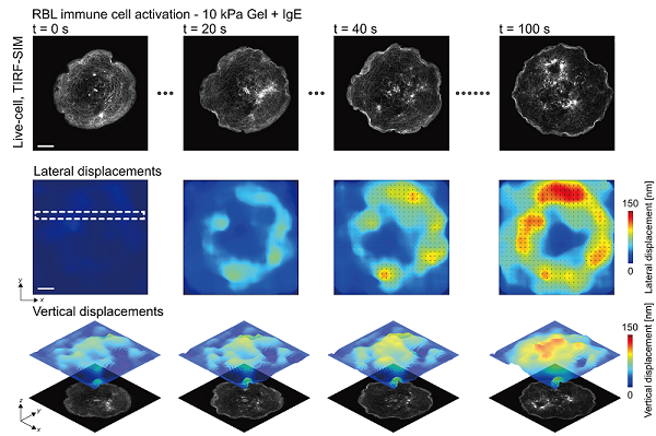 图2.aTFM-SIM活细胞成像观测RBL细胞免疫反应过程中的生物力,及其与微丝动态形变的关联