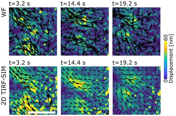 图3.原代鲑鱼角质细胞迁徙过程中的微小位移的观测结果,2D-TIRF-SIM能清晰观测到旋涡状的作用力产生过程