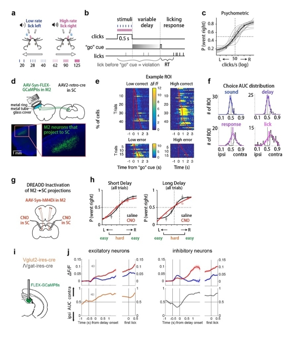 a、听觉二择一任务,小鼠根据声音的滴答频率选择舔左边或右边的水嘴。b、任务的时间结构,在听到声音后,小鼠需要等待0.3-1.5 s,并在延时结束后听到一声提示,之后再进行作答。c、小鼠行为学的心理物理曲线。d、双光子成像记录投向上丘的次级运动皮层神经元。e、示例神经元展现出对动物行为的选择性。f、随着时间推移,越来越多的细胞展现出更强的选择性。g、用药理遗传学特异性地抑制次级运动皮层到上丘的环路。h、环路抑制以后长延时的刺激难度高的试次中小鼠的行为学影响更大。i、用光纤光度测定的方法记录上丘不同细胞类型神经元亚群在运动规划过程中的反应特性。j、兴奋性和抑制性上丘神经元在运动规划中体现出不同的反应特性