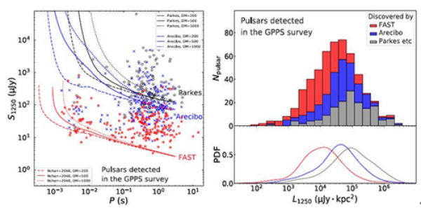 FAST-GPPS巡天灵敏度与其他巡天项目对比。左图,FAST-GPPS脉冲星搜寻灵敏度曲线及巡天探测的脉冲星;右图,GPPS与Arecibo、Parkes等望远镜发现的脉冲星光度函数分布比较。