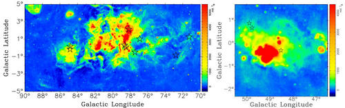 新发现的脉冲星中,一部分特殊脉冲星的色散量超过目前最好银河系电子密度分布模型(NE2001和YMW16)的预计。如果利用银河系电子密度模型估算脉冲星距离,这些脉冲星应坐落在银河之外。考虑到银河系在这些方向有银河系的旋臂,它们含有大量电子气体云团(图2),很可能是银河系模型中这些云团的数目或云团里的电子密度被严重低估。因此,新发现的脉冲星对当代通用的银河系电子密度模型提出了挑战。