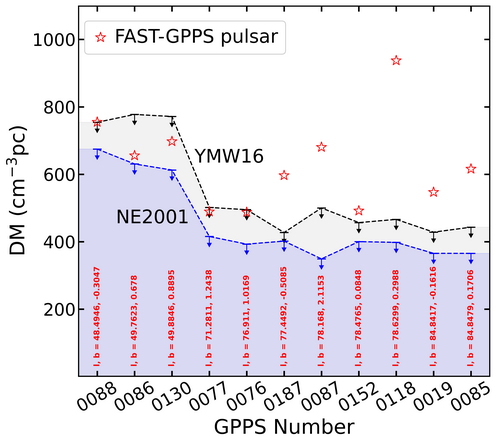 位于银河系本地旋臂(上左图)或人马旋臂(上右图)的新发现脉冲星(五角星)具有超常的色散量(DM),远超经典银河系电子密度模型估计。下图展示了新发现脉冲星的DM与两种银河系电子密度模型估计的最大DM值的比较,所有脉冲星DM均超出银河系电子密度模型NE2001在该方向的最大值,6颗脉冲星超出银河系电子密度模型YMW16给出的最大值。