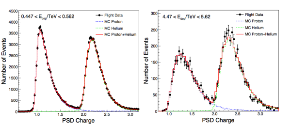 图1.“悟空”号电荷谱:500 GeV能段(左)和5 TeV能段(右)