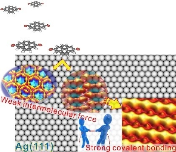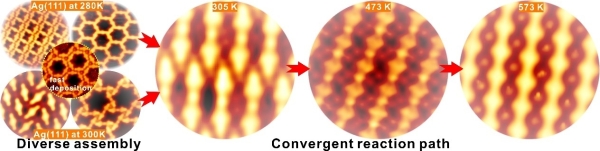 不同于此前文献报道中自组装策略可以调控表面Ullmann反应路径,该研究发现,Br2Py(2,7-Dibromopyrene)在Ag(111)表面上的Ullmann耦合反应路径是唯一的。无论预构筑的组装结构如何新奇独特,经过热催化激发非对称性脱溴反应后,均被诱导到brick-wall构型的有机金属二聚体;进一步的加热,得到长程有序的有机金属链;最后,得到高度有序的纳米带。此反应路径背后的物理化学机制可以解释为:组装纳米结构之间的弱相互作用(hydrogen bonding和halogen bonding)无法主导反应路径,而Br2Py前驱体分子两端的溴原子脱掉后,金属-碳和碳-碳共价键形成,强的共价作用力轻松碾压弱的分子间相互作用力,从而主导了整个Ullmann偶联反应路径。