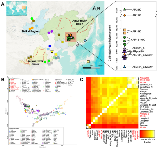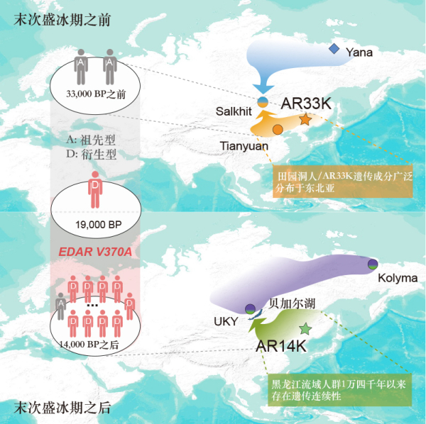 该研究指出,生活在末次盛冰期前、距今约3.3万年的AR33K个体与距今4万年田园洞人的遗传成分相似。这表明在末次盛冰期之前,田园洞人相关人群在东亚北部广泛存在(图3)。