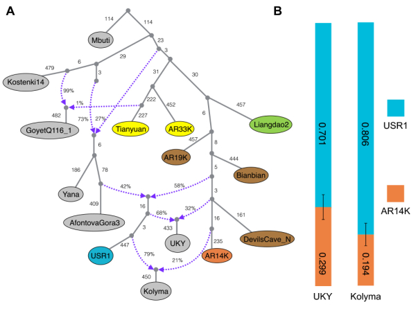 图4.qpGraph(A)和qpAdm(B)人群混合结构模型