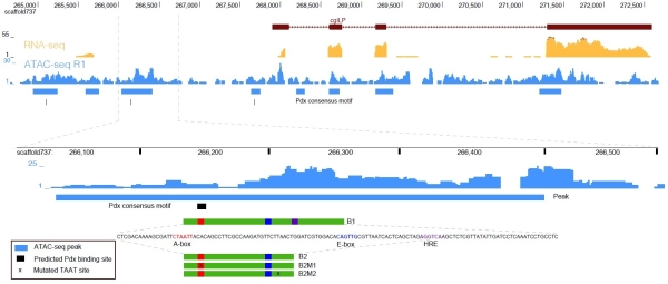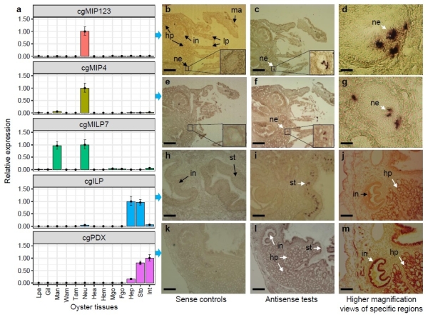 随着基因组信息的不断积累,学界意识到海洋冠轮动物可能由更加原始和普遍的基因组成。许飞长期以来聚焦于贝类激素调控系统,研究海洋无脊椎动物基因调控网络的演化历史。该研究系统分析了长牡蛎类胰岛素基因家族成员的结构、表达及其进化特征,发现牡蛎类胰岛素基因多样性丰富,在两侧对称动物的主要类胰岛素成员中具有广泛代表性。该研究进一步通过转录组技术,探讨了动物肠道系统的同源性,发现贝类和脊椎动物中肠系统具有较大的功能相似性,贝类“肝胰腺”和脊椎动物复杂的肠道系统各自独立进化,但可能都源于表达Pdx基因的内胚层区域。通过靶向开放染色质技术,鉴定到cgILP基因的转录调控区,并鉴定到cgPdx基因的结合基序。通过双荧光报告基因实验和染色质免疫共沉淀等技术,证明了牡蛎Pdx和NeuroD的协同作用可以调控牡蛎cgILP的表达。