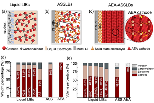 图1.全电化学活性电极的概念:a.商用锂离子液体电池(正极:74.6~83.6wt%;负极:石墨)。b.常规ASSLBs(正极:80wt%;负极:锂金属)。c.全电化学活性电极(AEA,正极:100wt%;负极:金属锂)。d和e:各种组分的重量和体积百分比的总表。