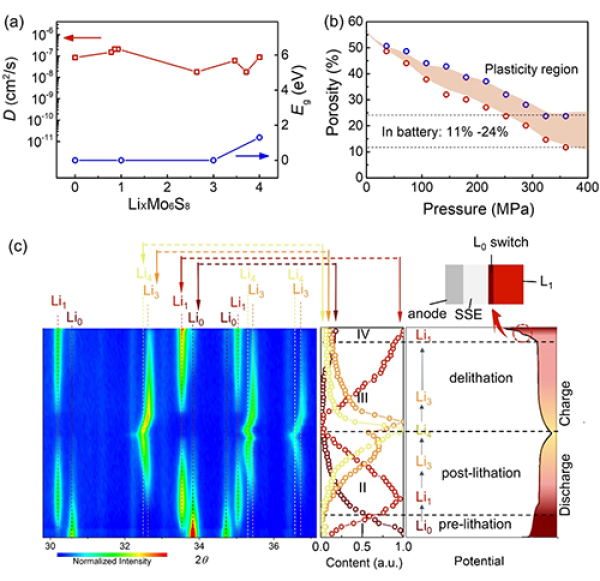 图3.基于LixMo6S8的AEA电极的电化学机理:a.LixMo6S8的锂离子扩散系数和带隙(x=0, 1, 3, 4)。b.AEA Mo6S8电极孔隙率与施加压力的函数关系。红色圆圈代表带压力的值测试,蓝色圆圈代表释放压力的值测试。c.左图为LixMo6S8型AEA电极原位XRD分析。中图为不同阶段的归一化峰强度,并伴随充放电曲线(右图)的相变过程。
