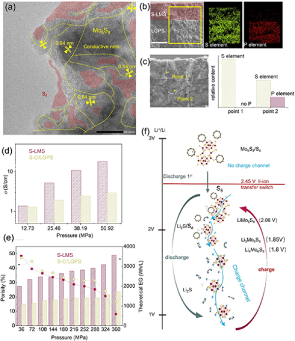 图4.复合S-LMS-AEA正极(32.5%S8-67.5%Mo6S8)的结构和电化学机理。a.TEM图像。b.AEA电极的横截面SEM。c.P和S元素的EDS分析。黑色标尺为20是50μm,白色标尺为50μm。d和e:S-LMS-AEA电极与典型的S-C-LGPS阴极的电子电导率、理论体积能量密度和孔隙率比较。f.S-LMS-AEA电极的电化学氧化还原机理。