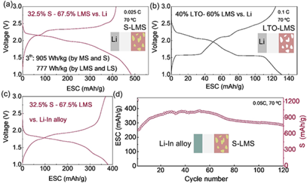 图5.高能量密度全活性固态电池策略。a-c:采用S-LMS(32.5% S8-67.5% Mo6S8)与Li、LTO-LMS(40% Li4Ti5O12-60% Mo6S8)与Li、S-LMS与Li-in合金构筑的全固态电池充放电特性曲线。d.采用S-LMS阴极的AEA电池的循环稳定性。