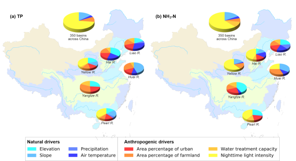 研究表明:2003年至2018年,全国十大流域河流水质总体改善。长江、黄河流域等六大流域水质显著提升,海河流域水质提升幅度最大;河流水体富营养化有所缓解,重金属污染逐步消除,不足0.3%监测点出现重金属污染;总磷与氨氮污染仍是近年水环境污染的主因(贡献率>85%),东部水环境污染比例(17.2%)大于西部(4.6%),东部沿海地区水环境污染最严重(24.4%);流域人类活动是河流总磷/氨氮污染的主导因素(贡献率>75%),流域人口密度、农田与建设用地面积比例是河流总磷/氨氮变化的主控因素,地形气象等自然因素贡献较小。