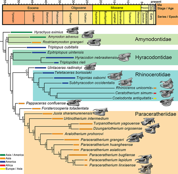 巨犀的系统发育关系此前只在属级水平上得到部分解决,未能通过支序分析揭示巨犀属不同种之间的演化谱系。研究团队在增加大量头骨、牙齿和头后骨骼性状的基础上展开了新的系统发育分析,解决了分隔于青藏高原南北两侧的不同巨犀间的起源和演化关系。得到的最简约树显示巨犀属与始新世晚期的咸海巨犀(Aralotherium)的关系比与准噶尔巨犀(Dzungariotherium)和吐鲁番巨犀(Turpanotherium)的关系更近,后两个渐新世晚期的属形成一个支系。在巨犀属支系中,新的系统发育分析指明,从蒙古高原的葛氏巨犀(Paraceratherium grangeri)经由兰州盆地的黄河巨犀(P. huangheense)、哈萨克斯坦的亚洲巨犀(P. asiaticum)、巴基斯坦的布格蒂巨犀(P. bugtiense),最终到新疆的美丽巨犀(P. lepidum)和甘肃的临夏巨犀(P. linxiaense)的逐步进化序列。临夏巨犀展现了相似于美丽巨犀的高度特化水平,且这两个种都具有更大的体型,比布格蒂巨犀大五分之一,而这三个种起源于一个共同的祖先。巨犀的环椎、枢椎对庞大体型和修长颈部的适应已在葛氏巨犀和布格蒂巨犀阶段完成,在临夏巨犀中进一步发展,其环椎、枢椎的形态特征和关节结构使其颈部更加灵活。