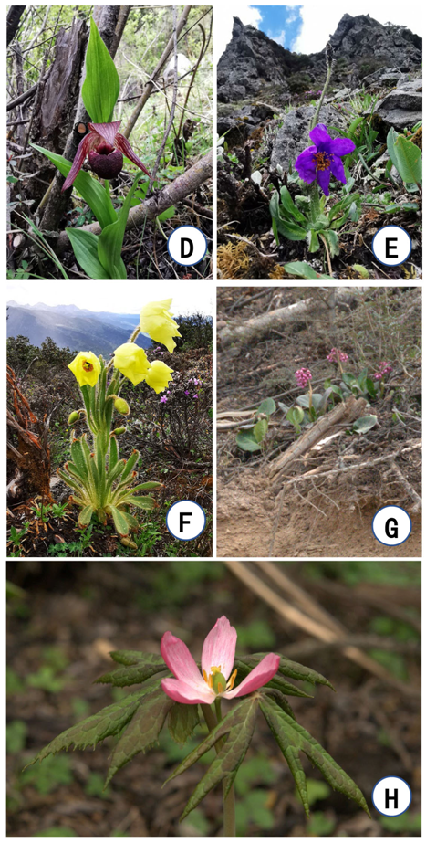 A.川贝母(Fritillaria cirrhosa) B.尖被百合(Lilium lophophorum) C.管花鹿药(Maianthemum henryi) D.褐花杓兰(Cypripedium calcicola) E.长果绿绒蒿(Meconopsis delavayi) F.全缘叶绿绒蒿(Meconopsis integrifolia) G.岩白菜(Bergenia purpurascens) H.桃儿七(Sinopodophyllum hexandrum) I.独花黄精(Polygonatum hookeri) J.卷叶黄精(Polygonatum cirrhifolium)