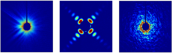 图1.标准样品圆孔、方孔及鹦鹉螺图案的相干衍射图样