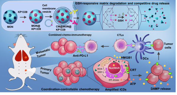 近期,中国科学院苏州生物医学工程技术研究所研究员董文飞课题组和华南理工大学研究员邵丹、大连理工大学教授孙文合作,构筑二硒键桥联介孔二氧化硅材料(MONs),通过配位和吸附作用担载含金属钌的小分子化疗药物(KP1339),并利用细胞膜包覆策略对载药纳米粒子进行功能化得到仿生纳米药物(CM@MON@KP1339)。一方面,通过材料中的硒和钌形成可控配位键,能够有效降低药物在运送过程中的意外释放;另一方面,材料可以响应肿瘤微环境中高水平谷胱甘肽(GSH)发生骨架降解,实现配位和还原双响应的药物可控释放。此外,该研究还发现,该材料具有调控肿瘤细胞的氧化还原平衡的生物活性,能够增强内质网应激,显著放大免疫原性死亡过程中相关因子的释放,进而增强肿瘤免疫原性。在此基础上,该仿生纳米药物通过联合免疫检查点阻断疗法,消除了乳腺癌原位肿瘤以及肺部转移灶,延长了小鼠的生存期,全程治疗未见明显的系统性毒性。