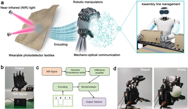 近期,中国科学院半导体研究所超晶格国家重点实验室研究员沈国震课题组设计出一种基于自驱动柔性可编织的光电探测器的光机通信系统。研究人员通过气相转移沉积在柔性可编织的纤维制得新的原位垂直生长的Te@TeSe纳米线阵列材料,并以该材料为基础制备出自驱动柔性可编织的光电探测器。该光电器件表现出较好的光响应(性能相对改良前提升了400倍),具有柔性、可编织,并展现出较好的稳定性。上述优异的性能表现也通过理论计算和仿真模拟得以证明。此外,研究人员将其应用于人机交互的窗口,设计出一种光机通讯系统:通过近红外光编码信息,经由光电探测器识别转化,实现对机械手等机械的控制操作。