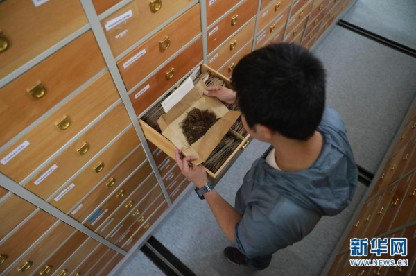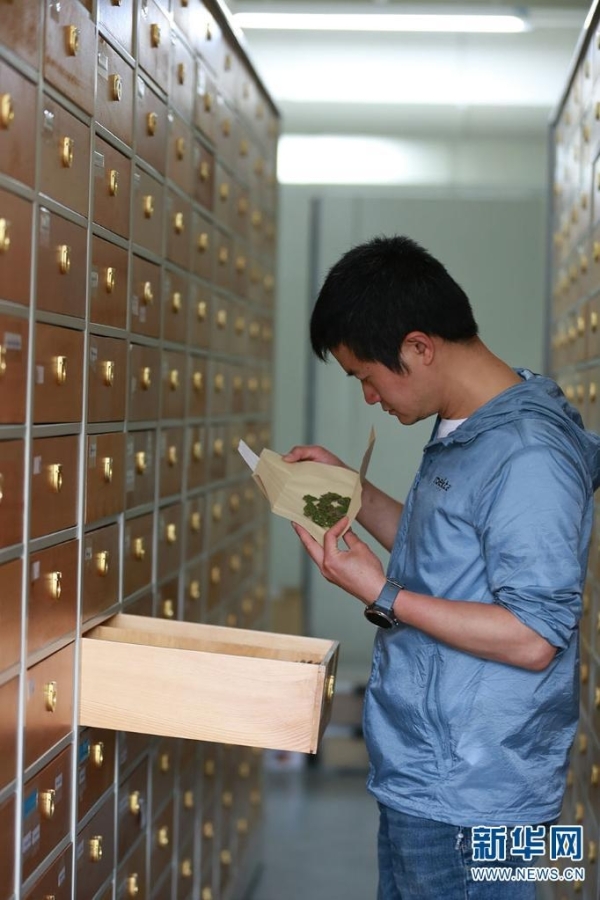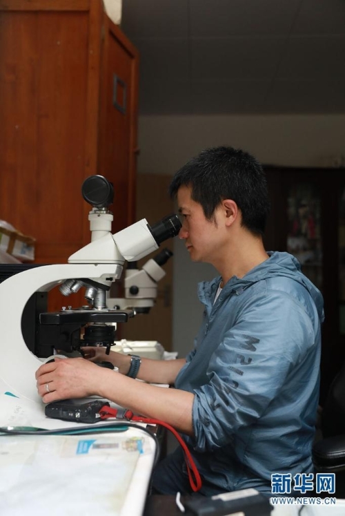 作为一名苔藓植物标本管理员,采集、保藏、管理和研究苔藓植物是马文章的工作职责。图为马文章在中国科学院昆明植物研究所标本馆内检查苔藓标本(6月5日摄)。