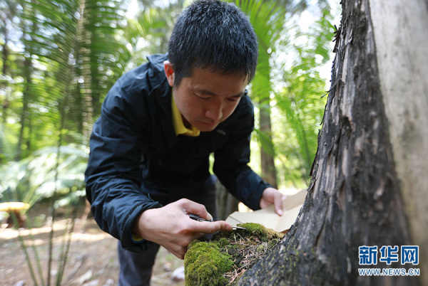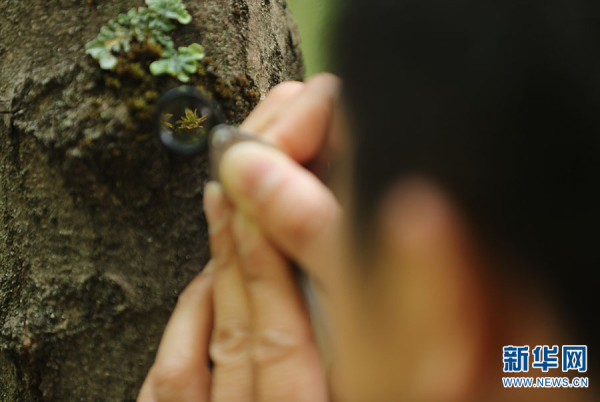 云南生物多样性居全国之首,据文献报道苔藓植物1906种,占全国苔藓植物种类的60%以上。图为马文章在野外采集时观察苔藓(6月5日摄)。