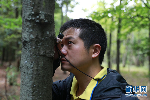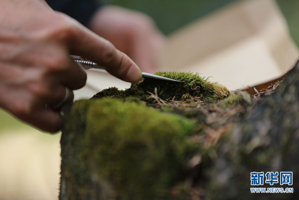研究苔藓不仅仅只是为了摸清苔藓的物种多样性家底,还可以通过辨识苔藓植物的物种分布,了解这个地方的环境质量。图为马文章在野外采集时观察苔藓(6月5日摄)。