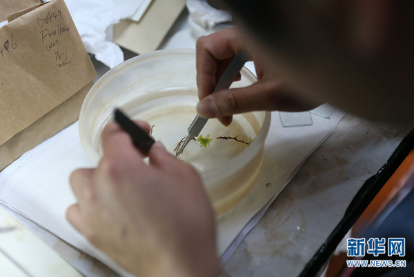 对马文章而言,“宝藏”就隐匿于之前采集的标本中。当然,未来将要采集的有针对性的标本也很重要。这些实物标本对于科研从业者们研究整个苔藓植物的物种多样性、起源和进化等都具有非常重要的价值。图为马文章先把采集回来的苔藓泡在水里,便于后续观察(6月5日摄)。