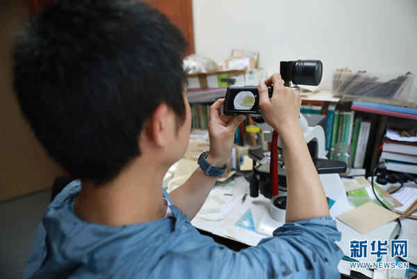 由于鉴定过程需要漫长的时间积累,无形中抬高了从事苔藓植物多样性相关研究的“门槛”。因此,从业人员人数稀少,相关科普出版物也略显匮乏。图为马文章在拍摄显微镜下的苔藓照片(6月5日摄)。
