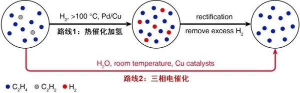 乙烯工业的发展水平是衡量一个国家石油化学工业水平的重要标志。工业乙烯原料来源于石脑油等碳氢化合物的裂解,裂解产物中不可避免地含有0.5-2.0%的乙炔杂质。乙炔杂质会毒化后续用于乙烯聚合反应的齐格勒-纳塔催化剂,影响聚合物产品质量。因此,需要在聚合之前将乙炔杂质的浓度降低至ppm(百万分之一)级别,目前普遍采用的是热催化乙炔加氢技术(图1-路线1)。然而,热催化加氢技术通常需要在100摄氏度以上的温度进行,且需要引入过量氢气,不仅易引发乙烯过度加氢,还会导致后续额外的气体分离操作。在更低温度下实现乙炔的选择性催化转化,同时避免引入额外气体杂质,仍面临挑战。
