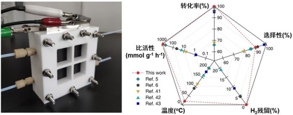 图2.三相电催化乙炔还原装置照片及其与热催化乙炔加氢性能比较