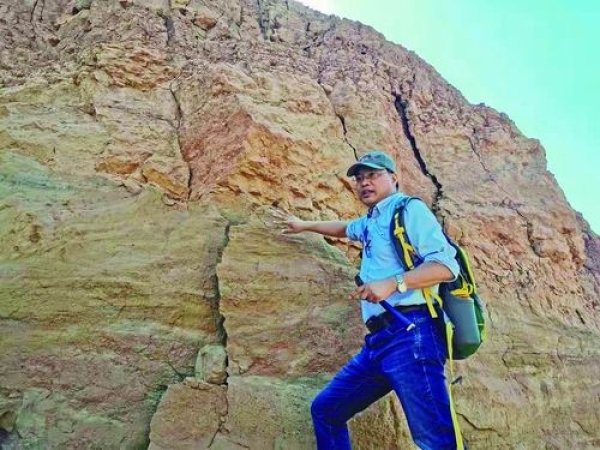 邓涛在“临夏巨犀”化石发掘点讲解。