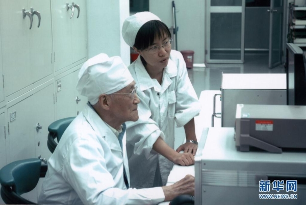 陆元九院士在航天时代电子公司激光陀螺实验室与同事探讨问题(2006年摄)。新华社发(中国航天科技集团供图)