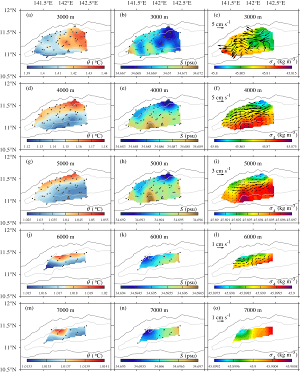 科研人员基于“海翼”滑翔机观测的高分辨率水文资料,分析了深渊中深层水团特性、环流结构及流经深渊的深层水流量。研究表明,挑战者深渊中的深层水团和环流存在复杂的三维结构(图2)。水团结构为近似三层分布,从3000米至7000米,先从东北-西南分布型变成南-北分布型,而后逐渐变成东-西分布型;这种结构或由地形导致的水体抬升、平流以及混合扩散过程共同作用而形成。深层环流主要为随深度减弱的西向流,且存在较大的深层水通量流经深渊。该研究有助于更全面地认识挑战者深渊的水文状况,相关研究成果以Ocean circulation in the Challenger Deep derived from super-deep underwater glider observation为题,在线发表在Geophysical Research Letters上。