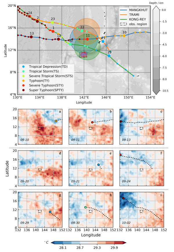 观测期间,“海翼”滑翔机还捕捉了当地上层海洋对三个过境台风(“山竹”“谭美”“康妮”)的热力学响应过程(图3a)。研究显示,在台风期间,海洋上混合层的降温为0.5-0.7°C,强风导致混合层的层结破坏与再生成,太阳辐射及近惯性振荡等其他过程也造成了混合层的振荡(图4)。研究还发现,在台风期间,两种分别由局地降水机制和平流机制导致的障碍层,强风强降水的同步会造成的海洋障碍层的高频变化。相关研究成果以Response of the upper ocean to tropical cyclone in the Northwest Pacific observed by gliders during fall 2018为题,发表在Acta Oceanologica Sinica上。