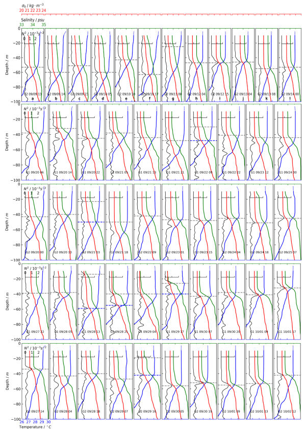 图4.三个台风期间的海洋上层温度、盐度、密度、浮力频率剖面变化图