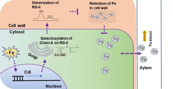 该研究为细胞壁生物合成调控质外体Fe再分配提供了直接证据,表明根部质外体Fe库的有效利用受到植物主动严密调控,而Cdi介导的果胶合成对于此生物学过程的调控至关重要。研究得到中科院战略性先导科技专项与国家自然科学金等的资助。