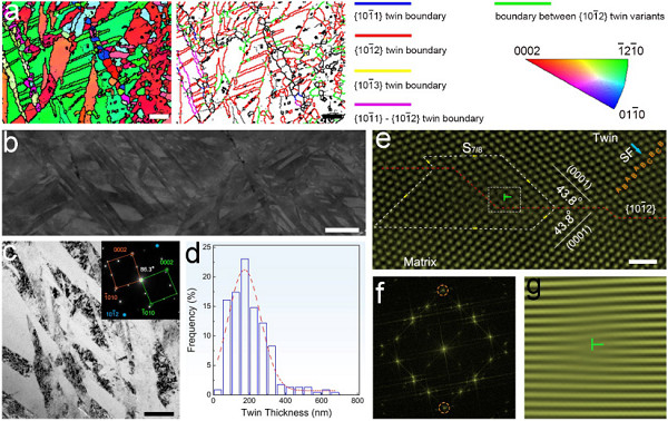 镁合金的密度是钢铁的1/4、铝合金的2/3,是最轻的金属结构材料之一,而低的绝对强度和耐蚀性限制了其实际工程应用。通常采用的剧烈塑性变形(SPD)方法对镁合金强度的大幅提升较为有效,可制备出超细晶超高强镁合金。然而,具有密排六方结构镁合金较差的冷变形能力,需要在较高温度条件下进行SPD加工处理,易造成晶粒长大,难以获得超细晶组织。传统SPD制备的超细晶所形成非平衡晶界会显著降低镁合金的耐蚀性。此外,传统SPD制备的超细晶镁合金样品尺寸小,难以在工程中获得应用。以往研究表明,孪晶组织可用于细化晶粒,提高强度,且孪晶界的能量低,不会对镁合金耐腐蚀性能造成显著影响。然而,镁合金中易启动的拉伸孪晶界面在应力作用下易长大和合并。因此,高密度超细孪晶组织的制备是亟须解决的关键问题。