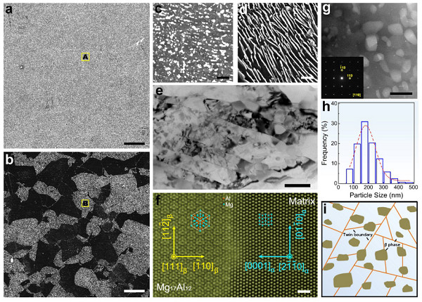 近日,中国科学院金属研究所核用材料与安全评价重点实验室研究员许道奎团队与南京工业大学教授信运昌课题组合作,在高强高耐蚀镁合金材料研究方面取得进展。科研人员采用多道次三向压缩技术制备孪晶组织,通过对压缩路径及道次应变的独特设计,利用12道次低应变和高应变循环交替压缩,在AZ80镁合金中制备出平均片层厚度约为200 nm的高密度孪晶组织,使平均晶粒尺寸从初始材料的33 mm左右细化至300 nm,其抗拉强度高达469 MPa,是目前已报道该系列镁合金中强度最高的。利用高密度超细孪晶组织细化晶粒,避免了非平衡晶界对耐腐蚀性能的不利影响,并改变了β-Mg17Al12相的形貌及分布。β-Mg17Al12析出相呈颗粒状,细小且均匀分布在镁基体中,显著抑制了局部腐蚀的发生,将腐蚀速率降低了一个数量级。
