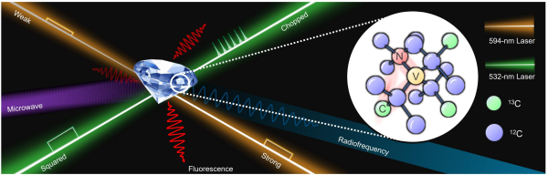 图1.金刚石中的单个氮-空位色心示意图。图片展示了实验中使用的各类激光、微波、射频等调控手段