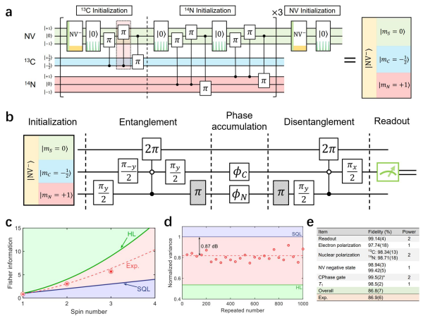 图2.a:电子自旋、核自旋和电荷态确定性联合初始化序列;b:进行纠缠干涉测量的量子线路图;c:量子费舍尔信息与量子比特数;d:对磁信号测量的涨落与重复次数的关系;e:双量子比特纠缠干涉中自旋态和电荷态初始化、自旋操控等各部分保真度