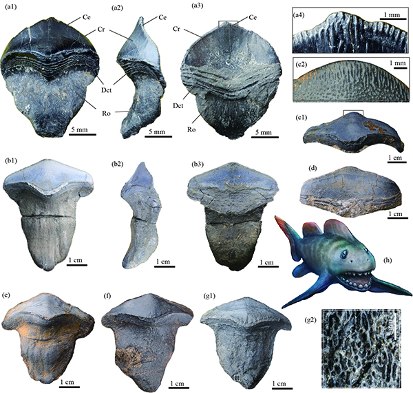 瓣齿鲨(Petalodus)是一类主要生活在石炭纪至二叠纪时期(距今约三亿六千万年至两亿五千万年之间)的原始软骨鱼类,从牙齿尺寸上来说,它们的牙齿大小与现生的大白鲨牙齿相仿,可以推测出瓣齿鲨是一类体长可达三米到五米之间的史前巨鲨;它是一个世界性属种,化石广泛分布于英格兰、苏格兰、爱尔兰、意大利、比利时、俄罗斯、斯洛文尼亚和北美等北半球的各大地区,但在南半球尚未发现它的踪影。此次研究表明,环绕在瓣齿鲨齿冠基部的水平叠瓦状脊纹条带,可能具有在牙齿刺穿肌肉软组织时,通过增加摩擦来防止猎物的逃脱的功能。因此,瓣齿鲨的生态位可能类似于现代大白鲨,是古生代海洋里的顶级掠食者。而瓣齿鲨在欧美以外的中国和日本发现,表明了它具有跨大洋迁徙能力,支持了瓣齿鲨极可能是一类游泳能力强的捕食者。