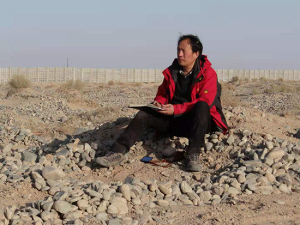 屈建军在沙漠里科考。受访者供图