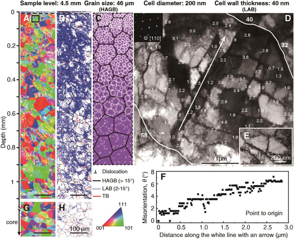 图1.Al0.1CoCrFeNi高熵合金中典型梯度位错结构。距离样品表面1.2 mm内(A、B)以及芯部(G、H)的截面EBSD结果显示晶粒(形貌、尺寸、取向)以及内部位错结构在空间上的分布特征;(C)梯度位错胞结构示意图;(D-E)表层晶粒内典型位错胞TEM结果显示平均位错胞尺寸为200 nm,胞壁取向差介于0.7o-4.8o;(F)对应D图单个晶粒内跨过诸多位错胞的累积取向差仅为7o。