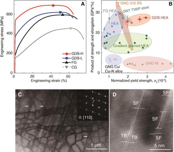 图2.梯度位错结构Al0.1CoCrFeNi高熵合金的力学性能和变形机制。(A)拉伸工程应力-应变曲线;(B)强塑积与归一化屈服强度曲线,表明梯度位错结构高熵合金的综合力学性能优于相同成分的其他均匀结构和梯度结构,也优于文献中其他梯度纳米晶和梯度纳米孪晶结构金属和合金;(C-D)拉伸应变为3%时典型变形结构的HAADF-STEM结果表明,梯度位错结构的塑性变形通过独特的超高密度亚十纳米层错和少量孪晶界协调。