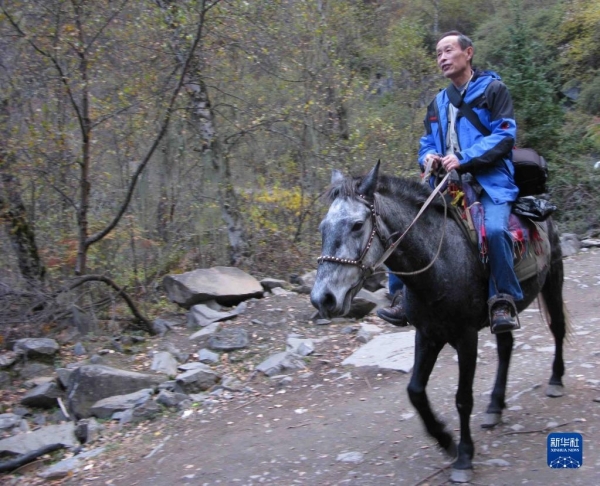 2014年10月27日,印开蒲在四川省茂县松坪沟科考时骑马前往目的地(资料照片)。新华社发