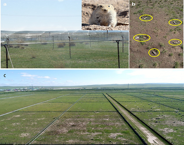 图1.布氏田鼠和喷灌设施(a)、因降水过多导致个体溺亡(b)和野外大型实验围栏(c)
