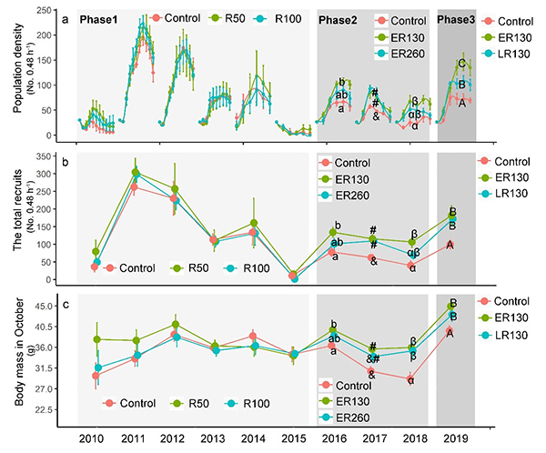 图2.不同降雨模式对布氏田鼠种群(a)、繁殖(b)和生长(c)的影响。Control,对照围栏。Phase 1(实验1期): R50, R100指均匀增雨50,100毫米。Phase 2(实验2期): ER130,ER260指增雨130,260毫米,偏向春季增雨。Phase 3(实验3期): ER130,LR130指增雨130毫米,分别偏向春季、夏季增雨。